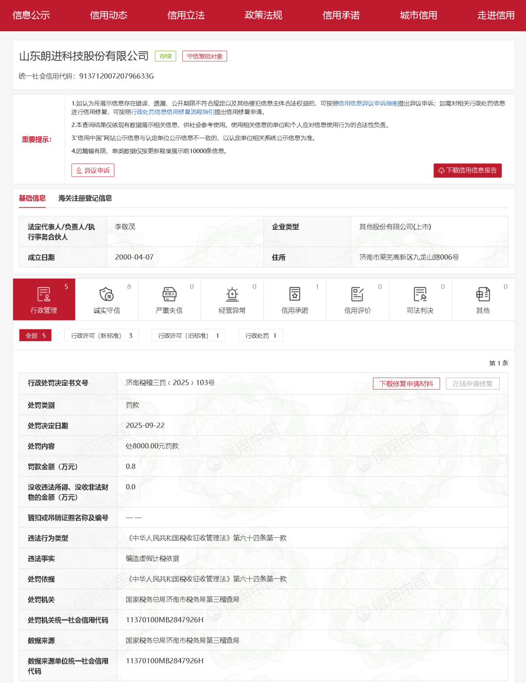 日前鼎泽配资,齐鲁晚报·齐鲁壹点记者从信用中国获悉,山东朗进科技股份有限公司(朗进科技 300594)因编造虚假计税依据鼎泽配资,被国家税务总局济南市税务局第三稽查局罚款8000元。