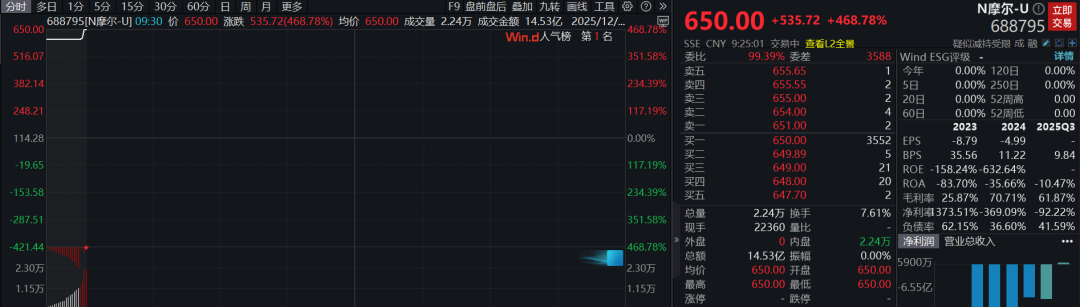 12月5日信通配资,摩尔线程在科创板上市,该股竞价高开超468%,总市值近3055亿,股价报650元,单签盈利高达26.786万元。