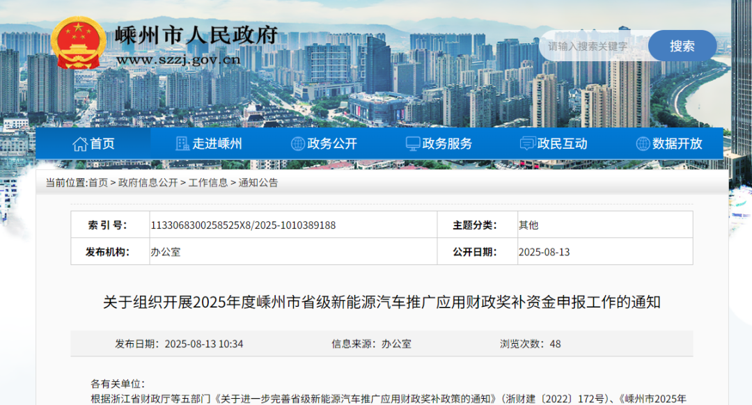 根据浙江省财政厅等五部门《关于进一步完善省级新能源汽车推广应用财政奖补政策的通知》(浙财建〔2022〕172号)、《嵊州市2025年省级新能源汽车推广应用财政补助资金使用方案》《浙江省财政厅关于提前下达2025年省级新能源汽车推广应用财政补助资金的通知》(浙财建〔2024〕172号)等相关规定,决定开展2025年度嵊州市省级新能源汽车推广应用财政补助资金申报工作。