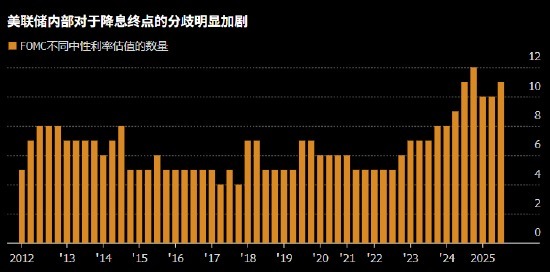 过去一年左右,美联储官员对于利率最终应当落于何处的看法,出现了至少2012年他们开始公布估值以来最为严重的分歧。这使官员们对下周是否应当再次降息,以及后续应当如何行动的问题出现了罕见的公开分化。